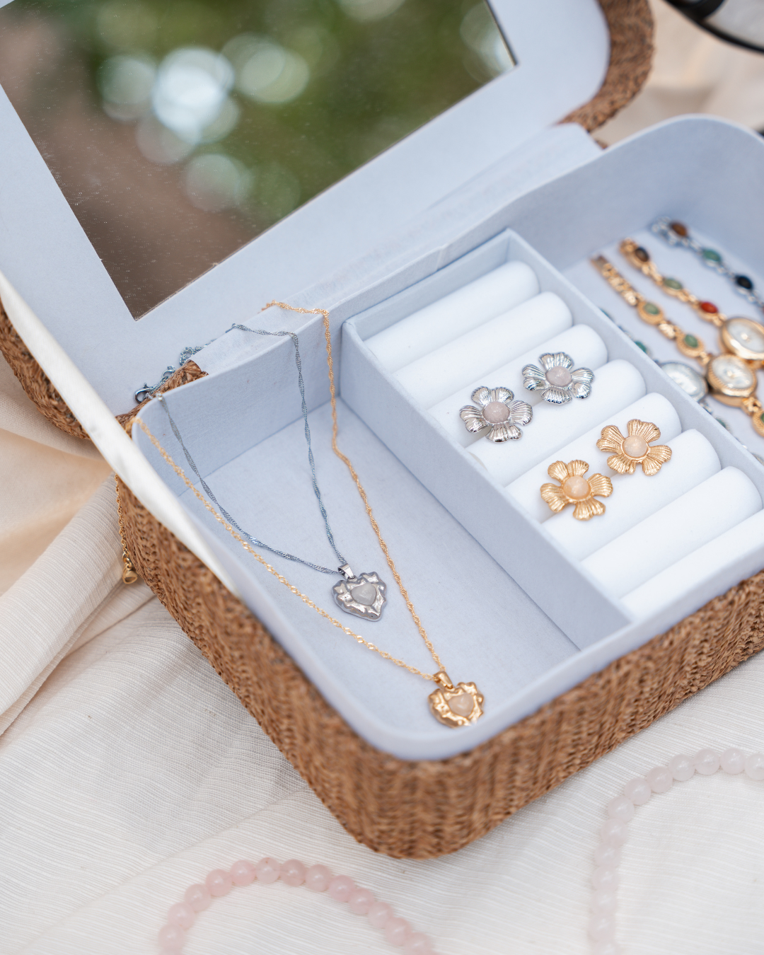 The Eternal Blossom Earrings capture the timeless beauty of self love. Crafted with rose quartz crystals, these earrings symbolize compassion, tenderness and the gentle power of your heart. They serve as a daily reminder to nurture yourself and let your inner beauty bloom.
